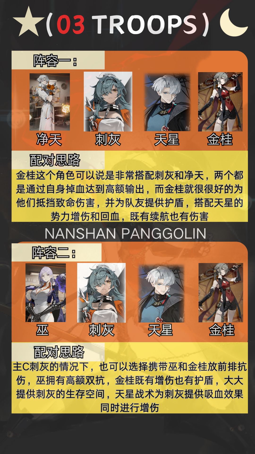 主C刺灰的情况下,也可以选择携带巫和金桂放前排抗伤,巫拥有高额双抗,金桂既有增伤也有护盾,大大提供刺灰的生存空间,天星战术为刺灰提供吸血效果同时进行增伤