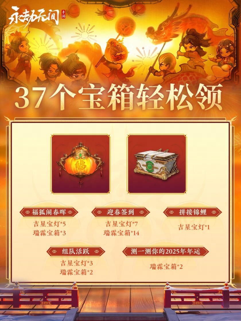 参与端外【新春组队】活动可得吉星宝灯*3,瑞霖宝箱*2。
