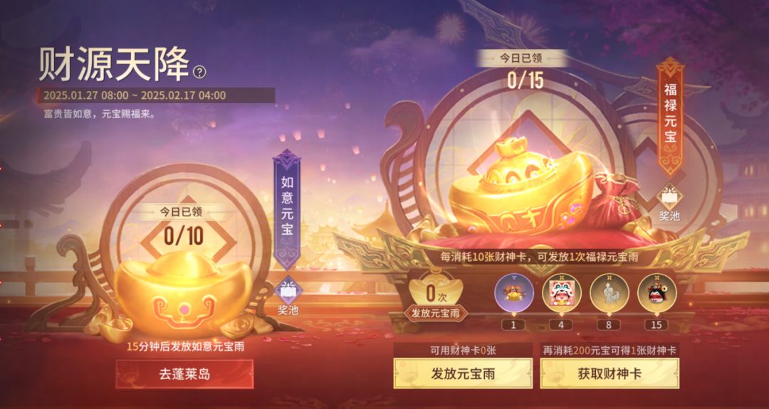 2025年1月27至2025年2月16日期间,蓬莱岛岛上每隔15分钟会发放一次如意元宝雨,开启福禄元宝还有机会获得50个吉星宝灯哦!