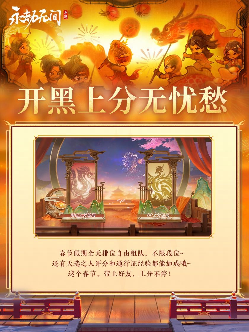排位不限段,活动加大分!春节假期全天排位自由组队、不限段位,还有新春助力经验加成,不要错过上分好时机!