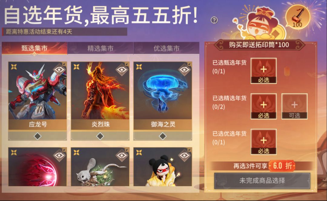 年货分为三个集市,分别是甄选集市、精选集市、优选集市,每个集市可选择自己喜欢的商品购买。