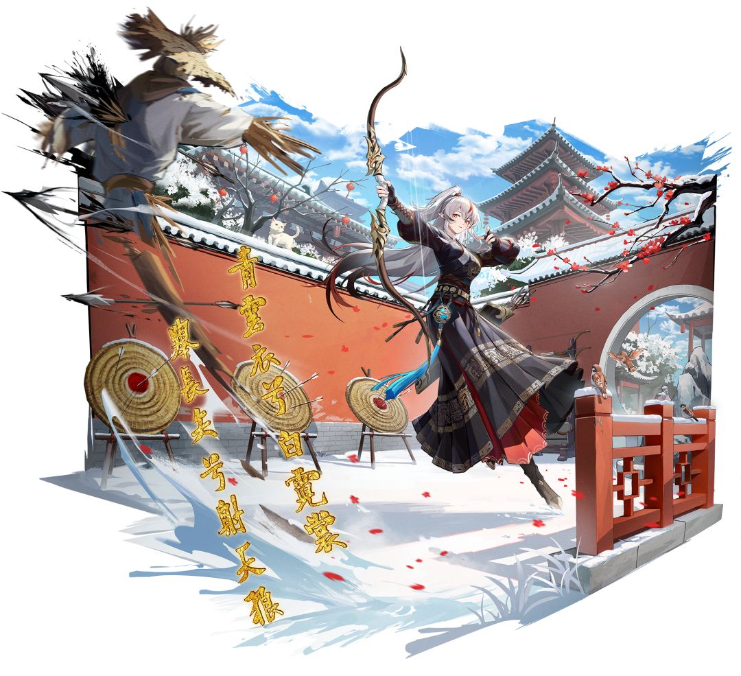 皮肤背景:红梅落雪满弦弓——捕快大人爱岗敬业,勤恳工作,在春节期间照旧巡街缉捕,护佑一方安危。深谙“话多误事”道理的她总随身携带着一把弓箭,有时候,能动手的事情,就不必多费口舌了。(集齐六艺系列皮肤激活背包专属海报)