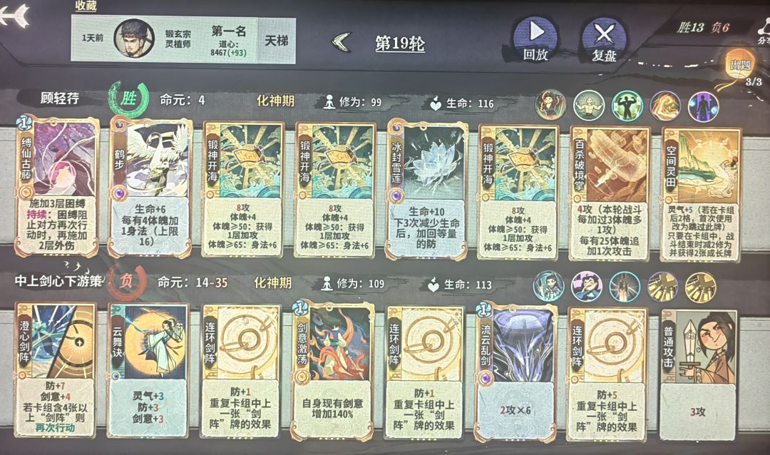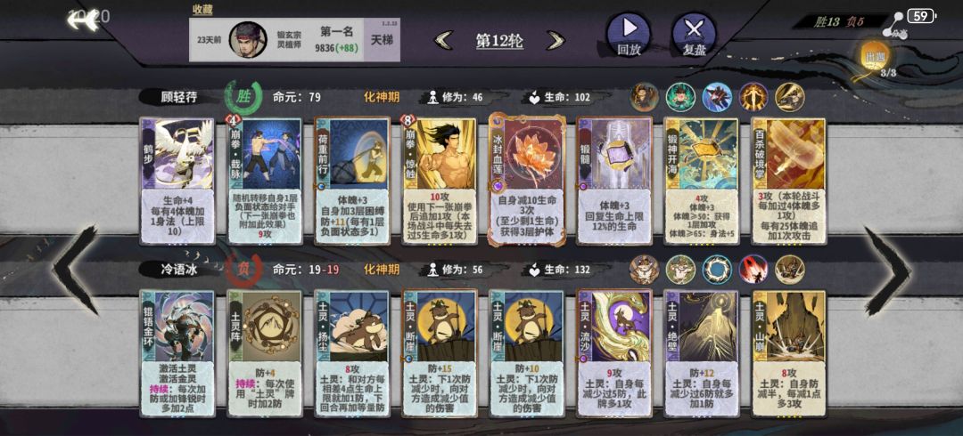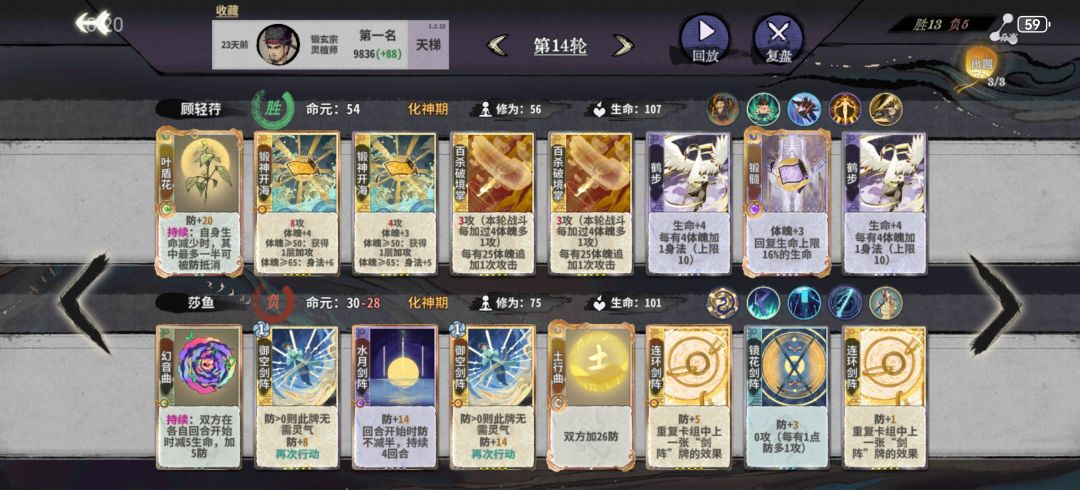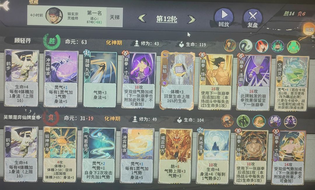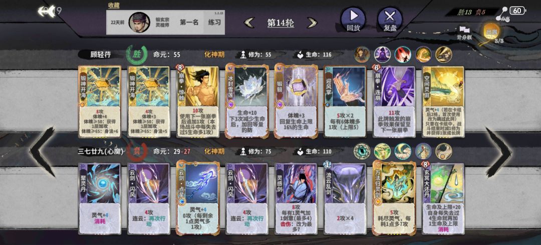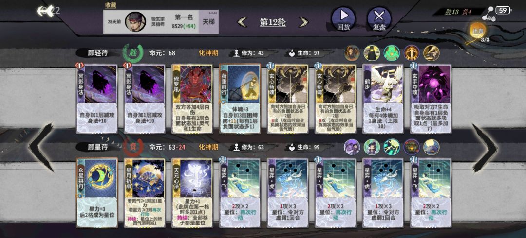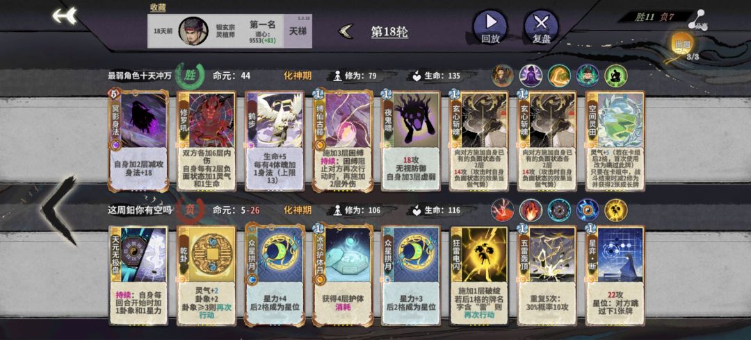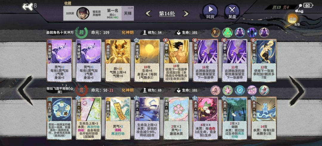 11或12轮上化神,如果容错不多就删紫书,容错多留紫书等紫书满级了再删。这一阶段罗刹扑+双鬼+多段的平铺5动仍然能杀,所以一般在来新牌之前不考虑其他的过渡方向,化神初一般只有来了崩天/迷踪/修罗+玄心+冥影的配套时才考虑改变过渡手段。体魄可以先不管,等必输的轮次强行拉练上去,当然如果能带紫书赢是最好的,自行判断。注意迷踪+双鬼+第五动的金书可以凑10身法,崩天+二级金书或者冲霄+一级金书可以凑10身法,二级冥影+二级金书可以凑10身法。随时做好身法的计算,有时候差身法需要用14身法的冥影代替13身法的鹤步。