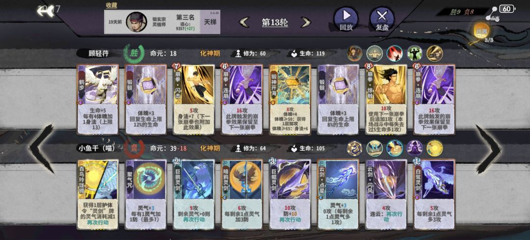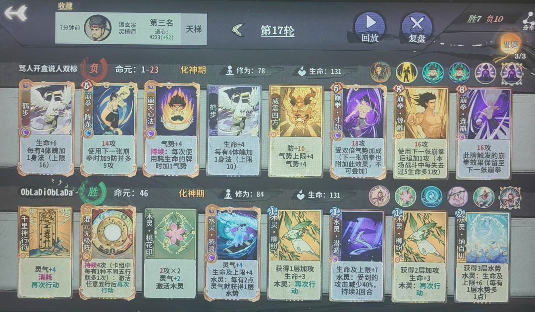 第五轮上金丹,大搜,因为这一打法需要满级的双鬼拍门以及大量的金丹卡(迎风饿虎),且需要激进删体魄,需要5至7轮都d满或有满级双鬼拍门了为止。打无防对手罗刹扑 双鬼拍门 迎风/剑支竹/饿虎四动即可击杀,中间可以插入荷重前行偷体魄,所以迅速删完其他锻体卡是至关重要的(这也是为什么 不能合任何一张锻体卡)。荷重前行也同样不合,平铺多张对位并强行拉上体魄,追求又锻又赢。