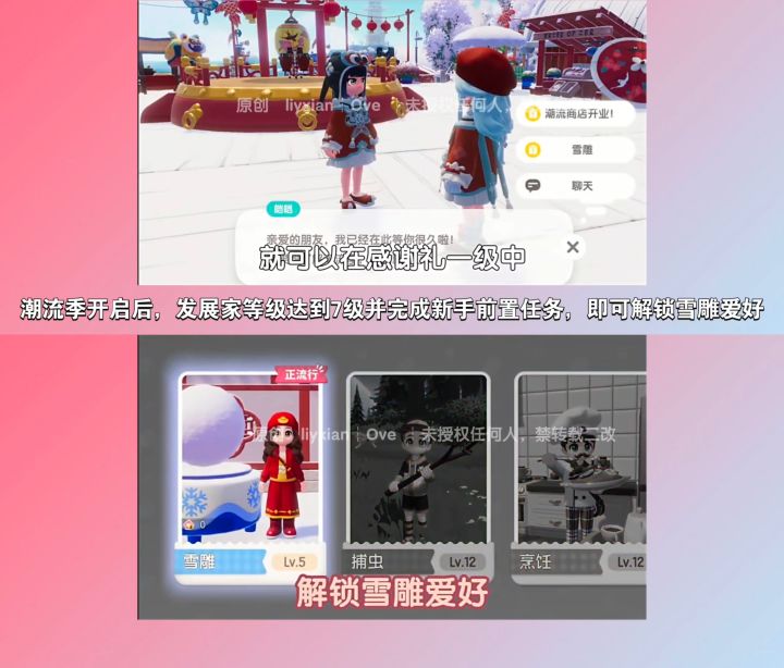 1月25日,新春季开启后,发展家等级达到7级并且完成新手前置任务,即可解锁雪雕爱好。