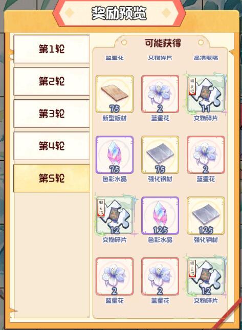 5轮奖励均可获得一件文物:平生一片心杯5、三彩鱼形壶6、兽面图画像砖7、越窑青瓷虎子8、清龙树菩萨唐卡9[每一轮一个文物]