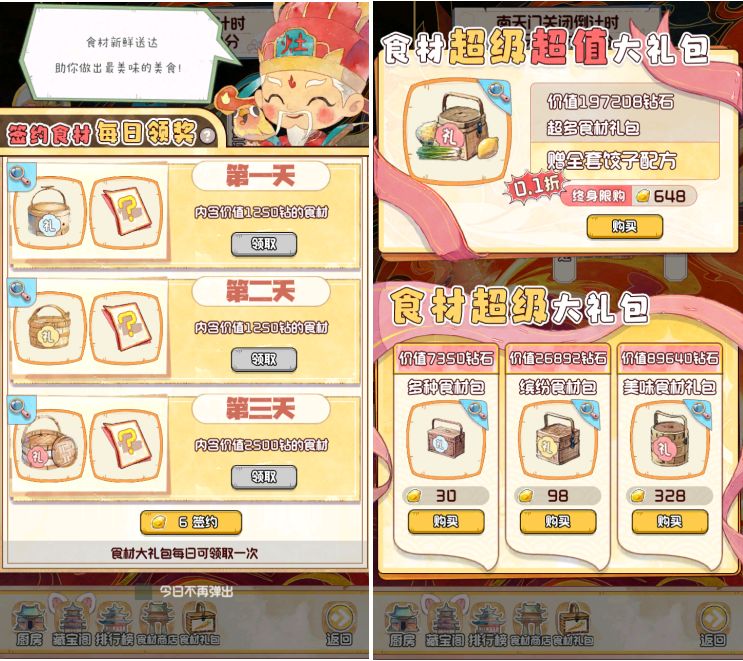 【食材】用于饺子皮&馅料制作,可以直接从厨房页面挑选食材补齐购买或者在食材商店花钻购买,此外每日特殊游客「灶王爷」可掉落食材礼包。