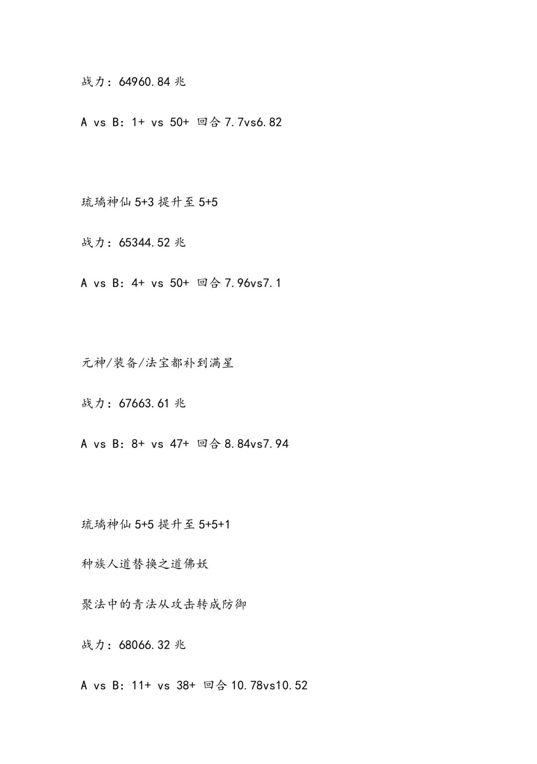 (攻击×3+生命×0.25+物防×5+法防×5)×(100%+命中+闪避+暴击+抗暴+加伤+减伤)×(100%+绝对加伤+绝对减伤+造化减伤+造化加伤)×(100%+格挡+破档+至尊增伤+至尊减伤+悟道加伤+悟道减伤+3级暴击+3级抗暴)ⅹ(100%+气运增伤×0.5+气运减伤×0.5+未来的其他属性)x神仙系数×幻仙战力系数=单卡战力