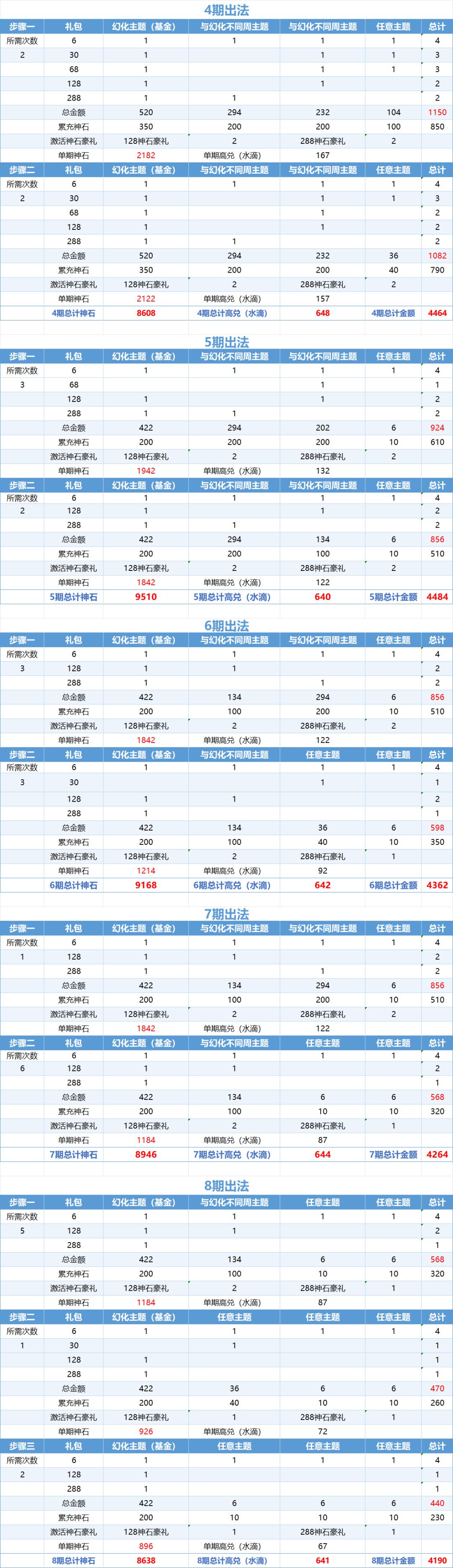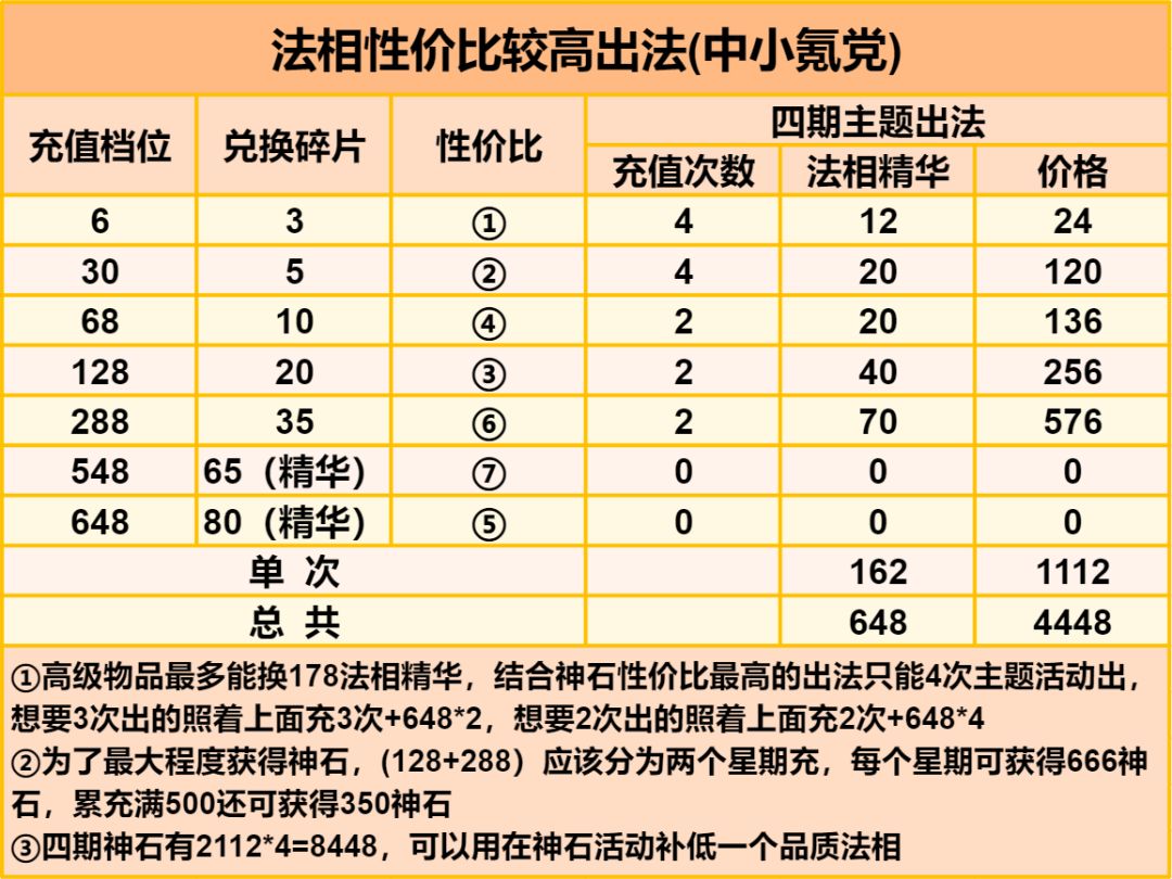 注4:部分出法价格还能压得更低一点,但几千都充了,没必要省那几十到一百多元,多充的那部分是为了激活累充档次,或者激活周神石,多获得的神石性价比超越多充的那点钱。