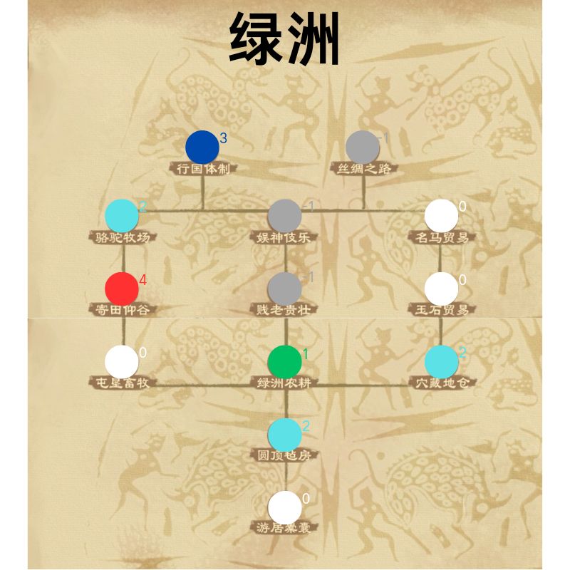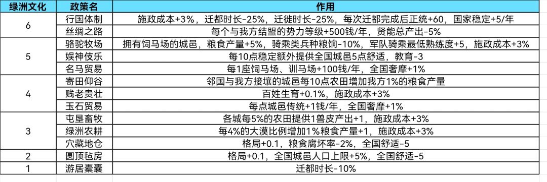 绿洲流派政策有一定的粮产、钱币加成,施政成本负面效果较大,还有些杂七杂八的加成,整体绿洲流派强度中等。