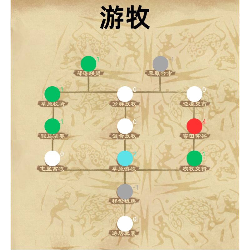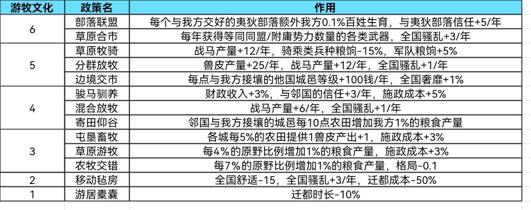 游牧流派除了有少数效果明显的粮产类政策,还有各种各种资源武器类加成,施政成本和骚乱负面效果较大,整体流派强度偏弱。