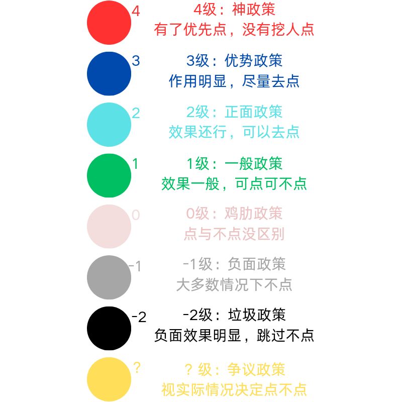 以上为对政策的评级分类标准,共分为﹣2到4共7个主要等级,对于同时具备正负面效果的政策,若在大多数情况下效果相对稳定,则归结为对应等级;反之若在不同条件下差异很大,则归结为争议等级"?级",并对其进行点评分析。关于政策带的加文化效果,本流派对应政策优先级适当提高。其他流派文化只要增长速度总体控制在本流派文化以下,其负面影响基本可以忽略不计。
