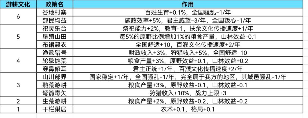 游耕流派政策有不错的粮产类加成,同时还有少量与国家、城邑特性有关的政策,总体来讲为礼法阶段较为中规中矩的流派。
