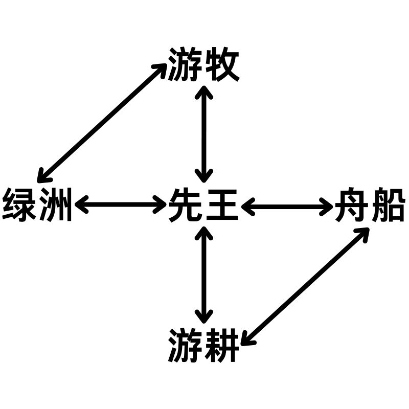中夏——先王 西戎——绿洲 北狄——游牧 南蛮——游耕 东夷——舟船