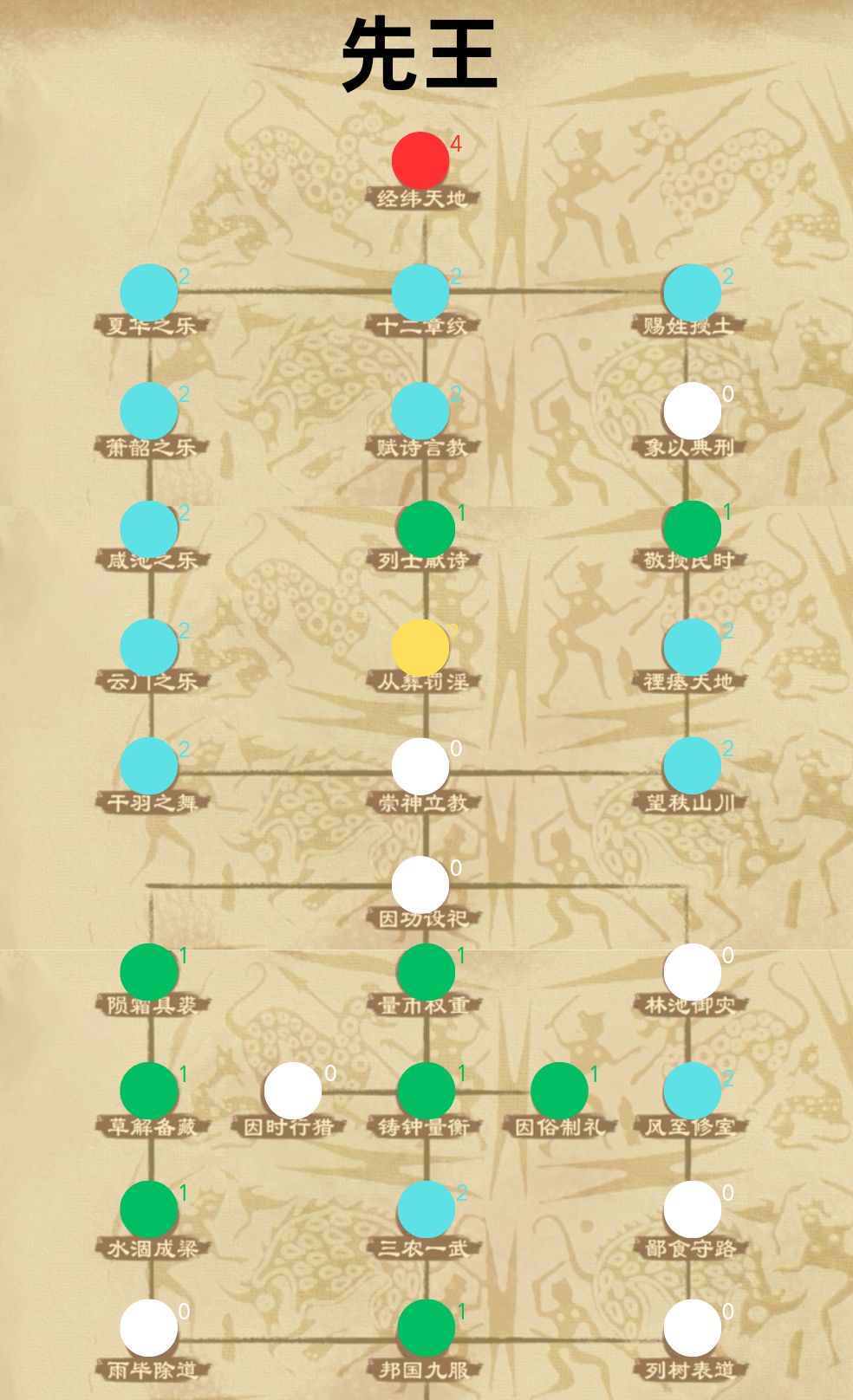 毫无疑问,先王流派就是礼法阶段最强流派,无论是开局先王能实施全部礼法阶段政策还是拥有能转阶段的流派技能[学宫辩论],这些都是其他流派望尘莫及的。先王政策主要偏向于国家的两大特性(国家稳定和君主正统)以及地方城邑骚乱特性,与祭祀也有一定相关。总体来讲,先王流派政策树比较杂乱,且没有负面效果的政策,为与九大诸子流派政策树媲美的存在。