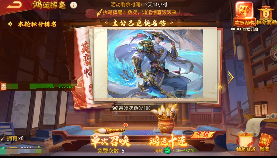 2、在抽奖开启期间,只要主公进行过1次挥毫,就能自动获得本轮抽奖的参与资格,挥毫次数越多,中奖概率越大;
