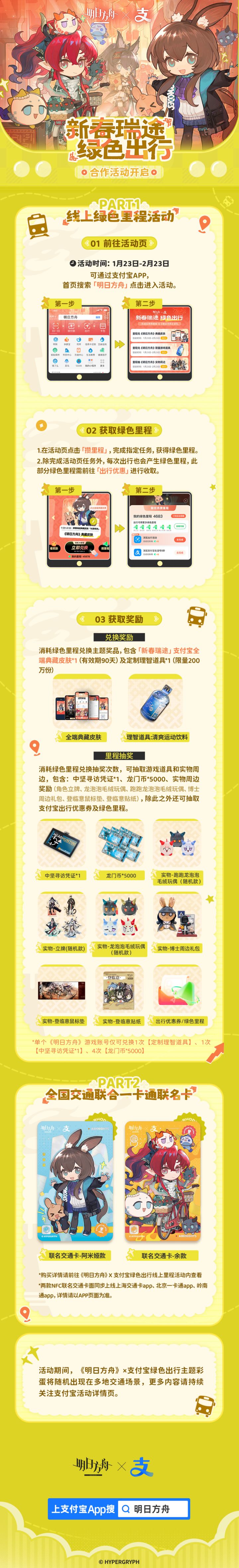 明日方舟 × @支付宝「新春瑞途,绿色出行」合作活动正式上线 一、【明日方舟 × 支付宝】绿色里程活动上线,1/23-2/23参与活动可兑换定制全端皮肤、定制理智道具奖励