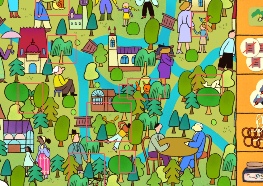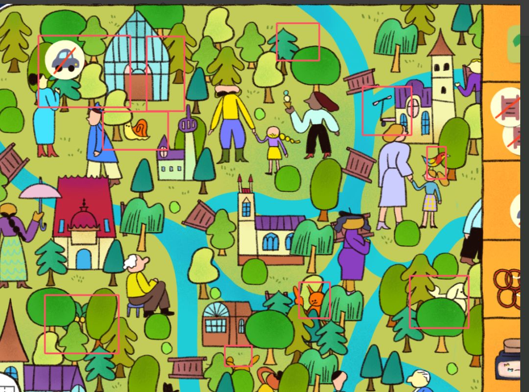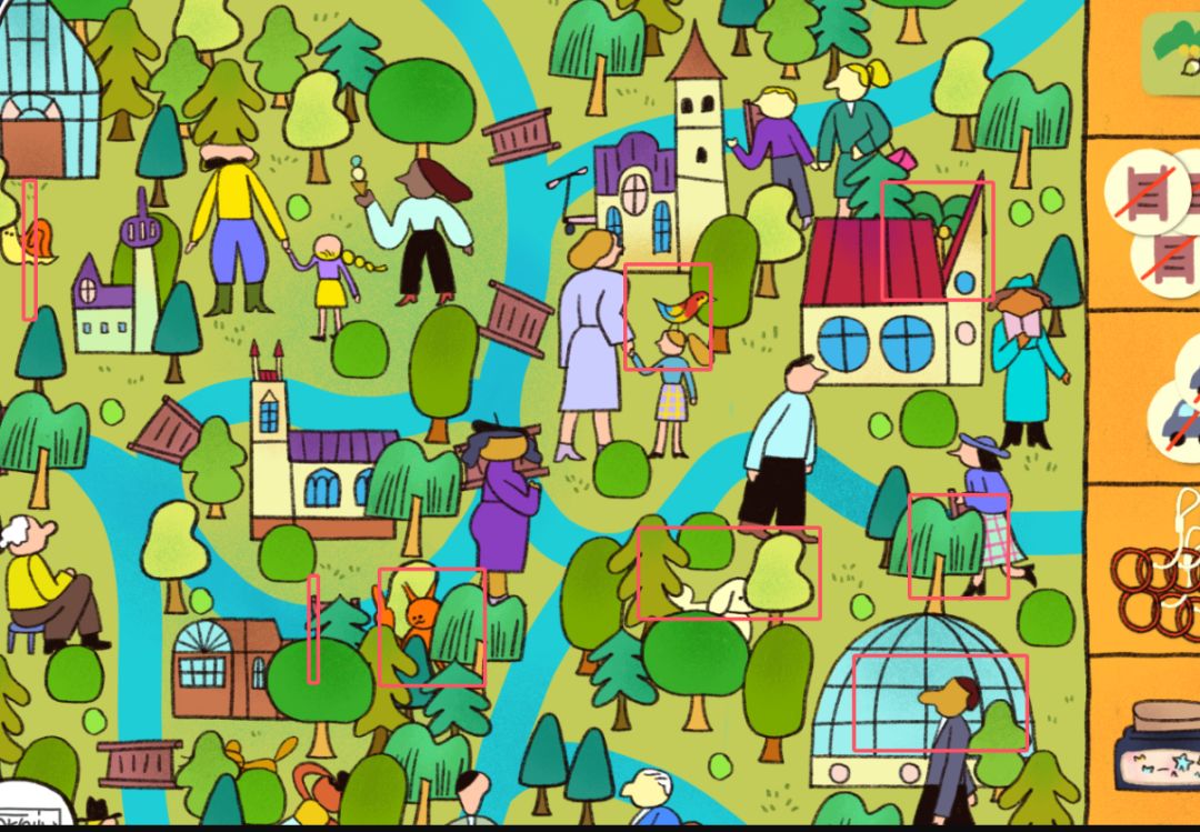 完成小游戏,圈住动物,找出车,椰子树,玻璃房。