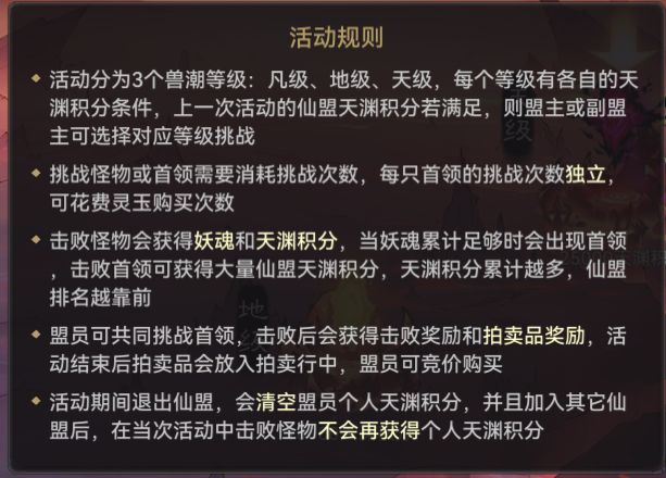 在加入仙盟后,每周的周二、四、六将会开启天渊兽潮活动,