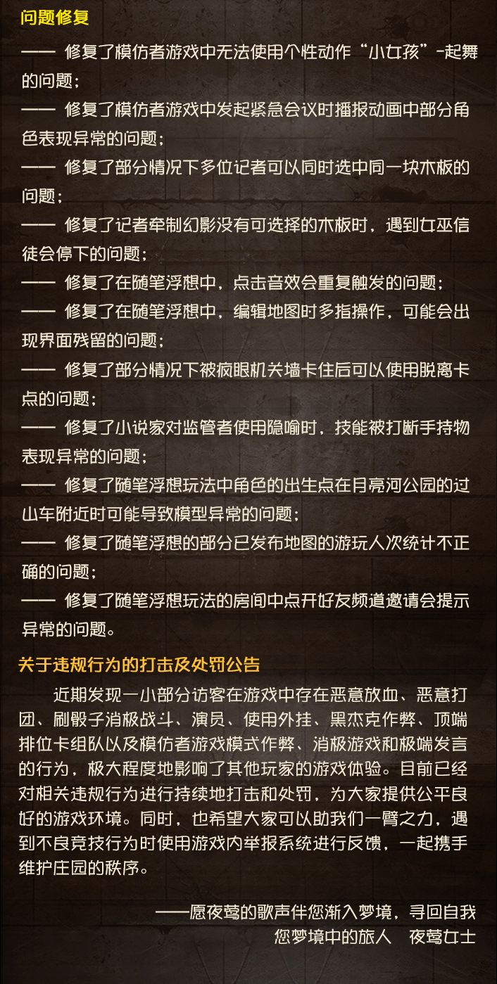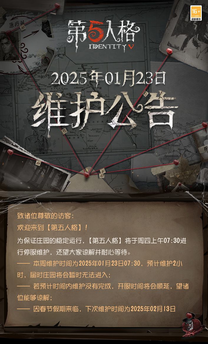 2025年1月23日维护公告: ——第三十六赛季·精华3正式开放,全新时装更新,包括【稀世时装】气象学家-采风的仙灵、【奇珍时装】园丁-郁金香之梦和【奇珍时装】26号守卫-蓝釉先生; ——【新求生者】-气象学家上线; ——第五人格×贪吃蛇大作战联动活动开启; ——新春活动“窑火除岁 彩梦贺新“第二阶段“言展话唐”阶段开启,春节限时公共地图“三彩迎禧”开放; ——深渊的呼唤Ⅷ - 终末之地阶段开启; ——宁芙奖系列【稀世时装】“杰克”-乌骨、【稀世时装】勘探员-枭徒上架商城,首周回声购买7.5折;【个性动作】“杰克”-祝福、【个性动作】勘探员-祝福永久上架商城; 1月28日: ——新春活动“窑火除岁 彩梦贺新”第三阶段“尘梦溯唐”阶段开启。 ——以下春节限定时装礼包将上架商城:【玉壶冰】(内含:【稀世时装】医生-司药,【稀世随身物品】医生-折柳)、【清平乐】(内含:【稀世时装】渔女-瑶彩,【稀世随身物品】渔女-灵河)、【将进酒】(内含:【稀世时装】牛仔-谪仙,【稀世随身物品】牛仔-清樽)。 2月6日: ——【第五人格×时光代理人联动】第二弹开启。 2月12日: ——【稀世时装】玩具商-花千树限时上架商城,首周使用回声购买7.5折。 更多内容请点击长图了解~ #第五人格维护公告