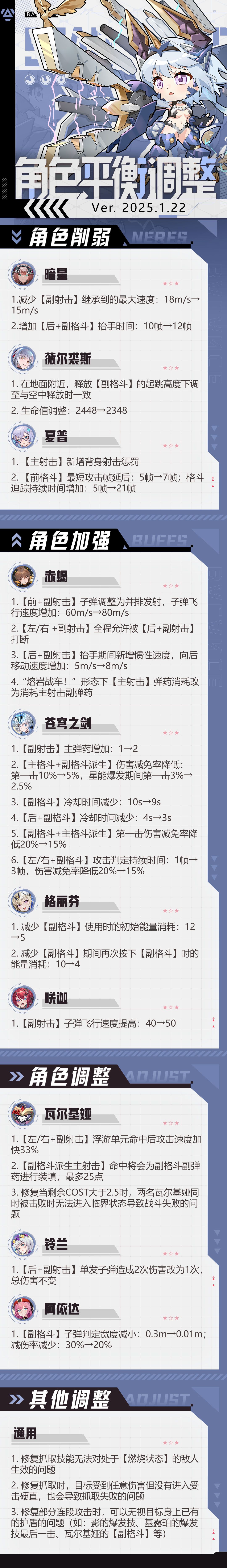 各位团长好,为了让团长们有更好的游戏体验,我们决定在1月23日游戏更新后对部分角色进行平衡调整,改动如下:
