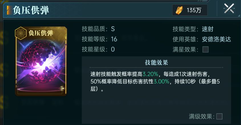 核心技能“星云之矛”,不仅拥有高额的速射伤害系数,同时可以提升自身速射技能的触发概率。这个技能是让她成为速射核心的关键所在,搭配上“负压供弹”技能的15%减抗效果,让队友和自身都拥有更强的输出。