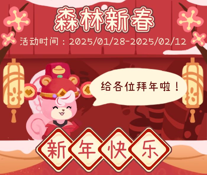 为了庆祝这一传统佳节,森林里的每个角落都将布满喜庆与温暖,新年活动欢迎各位森民们来参与!