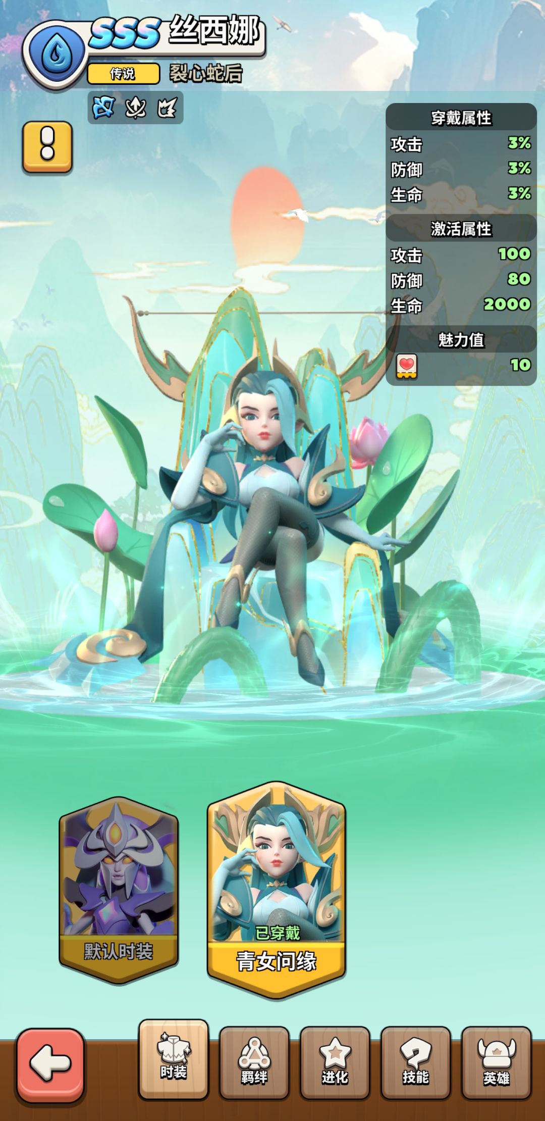 而丝西娜本人,穿戴后更可获得本英雄攻击+3%、生命+3%、防御+3%的额外加成,属性全面提升!