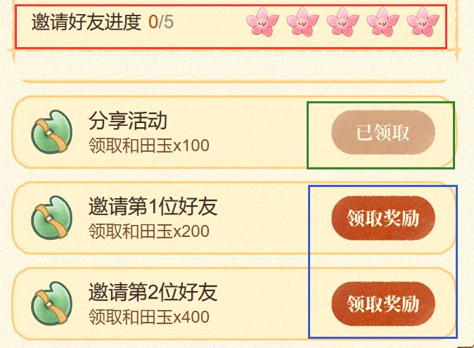 A:可以通过进度条查看哦(详见红框),坊主要是发现进度条+1,就可以根据对应的进度,领取对应的奖励哦(详见蓝框),要是有坊主忘记兑换奖励了,再次点击按钮,可再次查看奖励兑换码(详见绿框)。