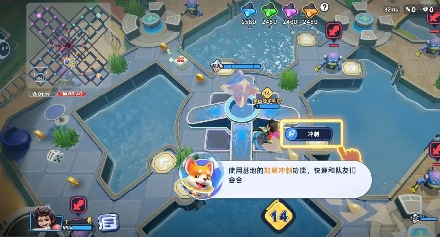 系统提示从出生的水晶冲刺去和队友抱团。场上总共有四个队伍,分别用四种颜色标明,我们需要和其他三队争夺据点,同时保护已有的据点。