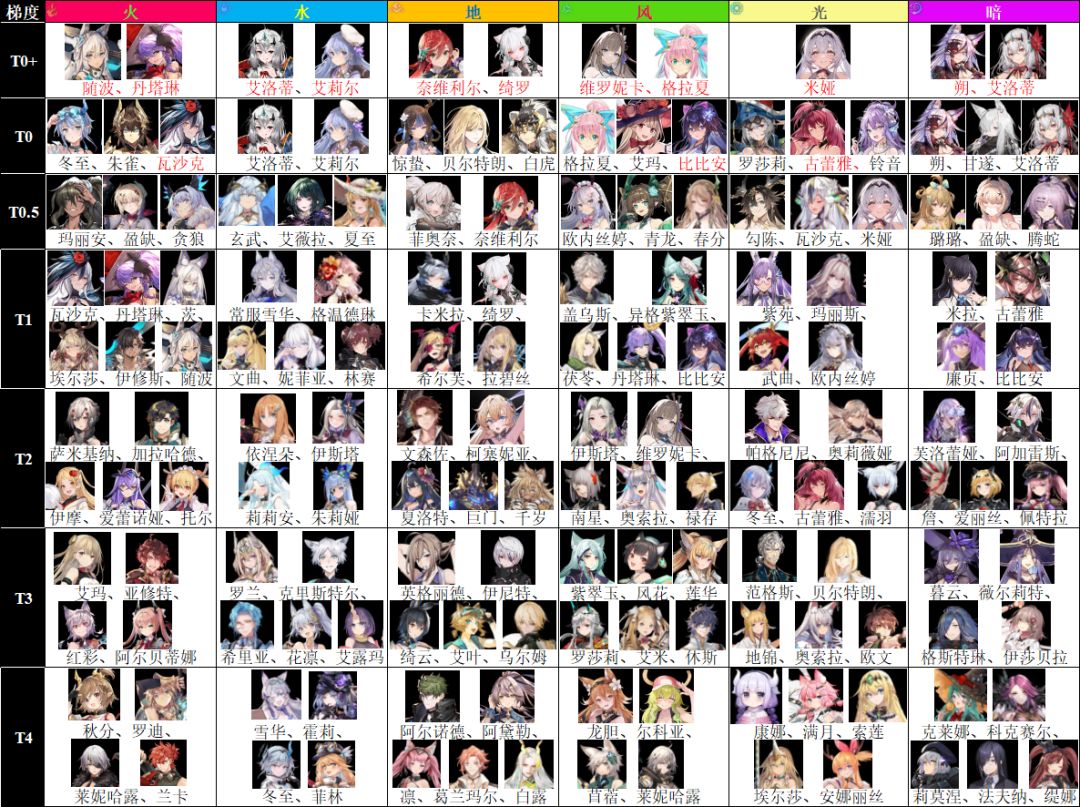 4、T0与T0+代表本属两队之一的核心角色,如果都没有则不推荐以该属性作为主要培养对象,T0+特指由于同调加护提升特别大以至于超过T0角色的情况;T0.5可以作为该属性两队之一的前排上场,仅在强度上略逊于T0角色;T1大部份情况下可以作为该属性两队之一的前排上场,在角色配置齐全的情况下需要根据环境和配置来考虑选择哪一个上场;T2泛用性一般,在特定场合下或角色配置不齐全时可以作为某些角色的下位替代;T3较弱,一般不会上场,只有在box不齐全的作为特定场合的对策解的时候才会偶尔有登场的可能;T4目前找不到上场的理由,可以当作不存在。