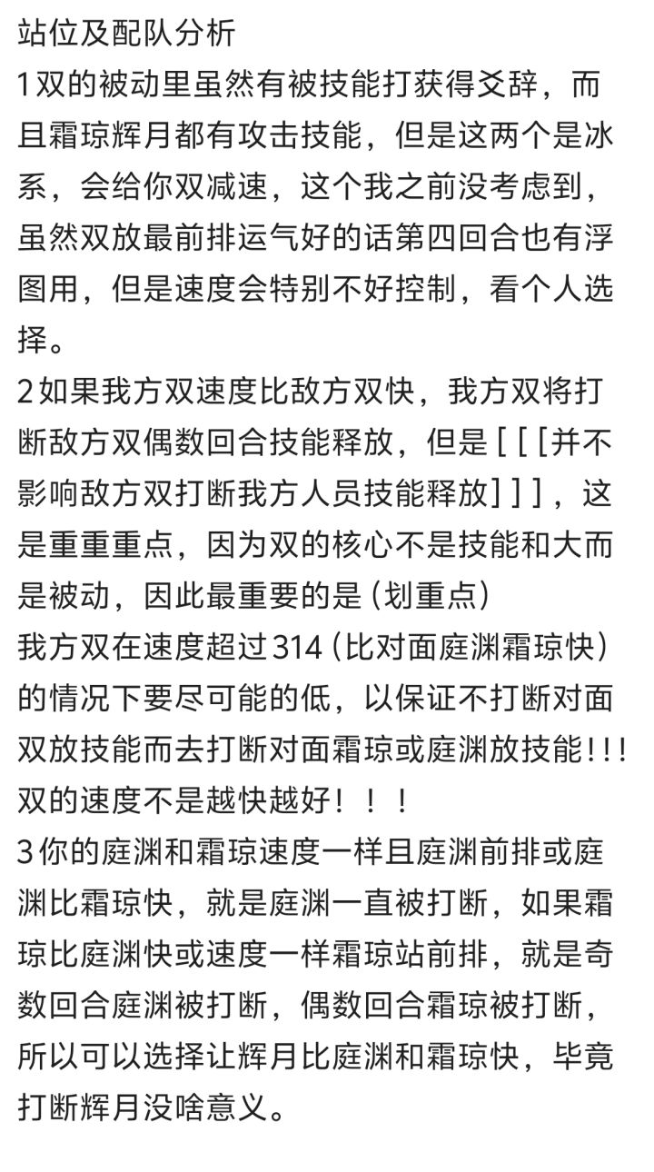 先解释一下双的核心技能,每次双行动后,才能打断敌人的攻击性技能导致双之后第一个发动攻击性技能的敌人只能普攻,考虑双满速380且全靠星源,比双快的人物只有阿尔戈(满速418)燕鸥(满速392)艾可(满速388),而且燕鸥和艾可没有攻击性技能,不点星源的情况下这三人专武带速度肯定也比双快,所以这三个人的技能是挡不住的。且自身受到技能攻击,开大后友方受到攻击,装备专武后释放技能,回合结束都能获得爻辞(6层爻辞可以转化成一层浮图),所以基本确实双可以至少前三回合阻止敌方一人行动,第四回合行不行主要看专武星数。