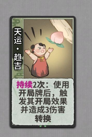 趋吉是个比较有用的牌,在筑基期和金丹,因为趋吉本身有3点伤害,趋吉配合卜命能够快速打出较高的伤害来进行过度。到了元婴后趋吉可以配合血光之灾可以给杯弓快速叠内伤。