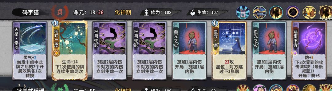 以上便为最后的卡组,是一个四动卡组,其中血光依靠共鸣快速叠内伤,使用杯弓进行终结,因为七星阁的再动要么要卦要么要蓝的原因,博弈卡组基本没有,而且一般需要满级乾卦,这里不做赘述,下面是一个卡组变种。