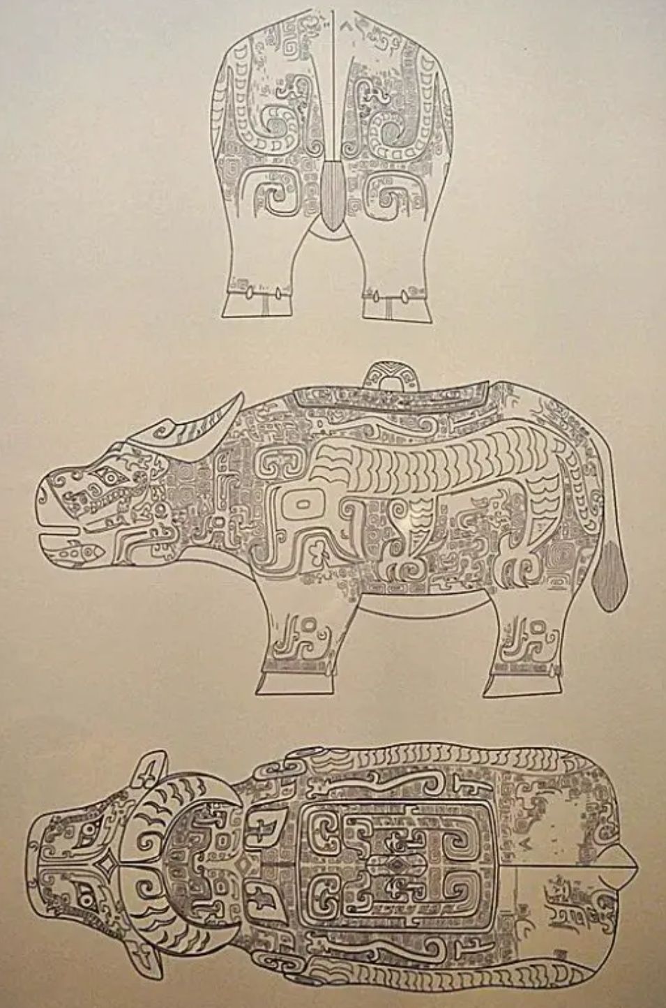 纹饰:牛尊身上雕刻有20多种动物纹饰,包括龙、虎、鸟、鱼等,其中最突出的是牛腹两侧各饰一只猛虎,虎头低垂于牛的前腿处,虎尾上卷在牛的臀部。
