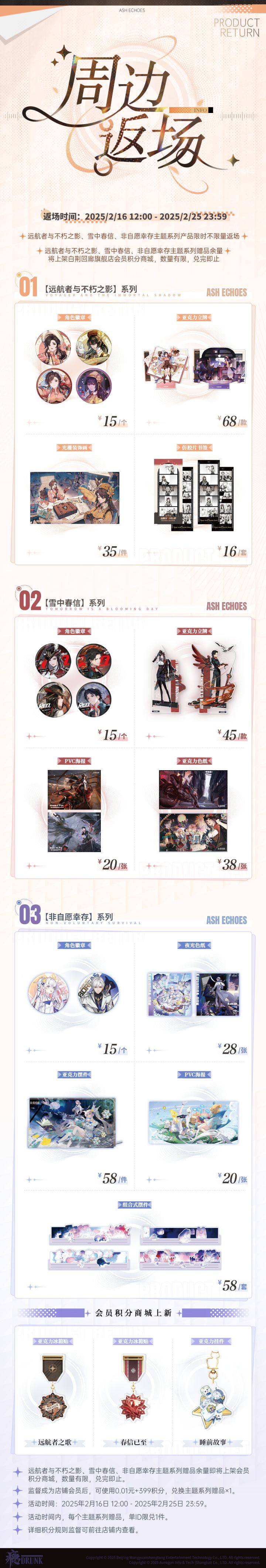 ※远航者与不朽之影、雪中春信、非自愿幸存主题系列赠品余量将上架白荆回廊旗舰店会员积分商城,数量有限,兑完即止