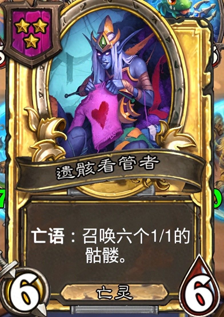 遗骸看管者这个赛季做了小调整,普通等级由原来召唤4只1/1的骷髅,改成了三只,但是金色效果不再是加身材,而是召唤数量翻倍,直接召唤6个1/1的骷髅。对于放不下流来说无疑是个好消息,配合普通瑞文就是11轮buff,加上本身是亡灵属性,而且又在三本,能点金合金也容易,是这个流派最好的触发胚子。