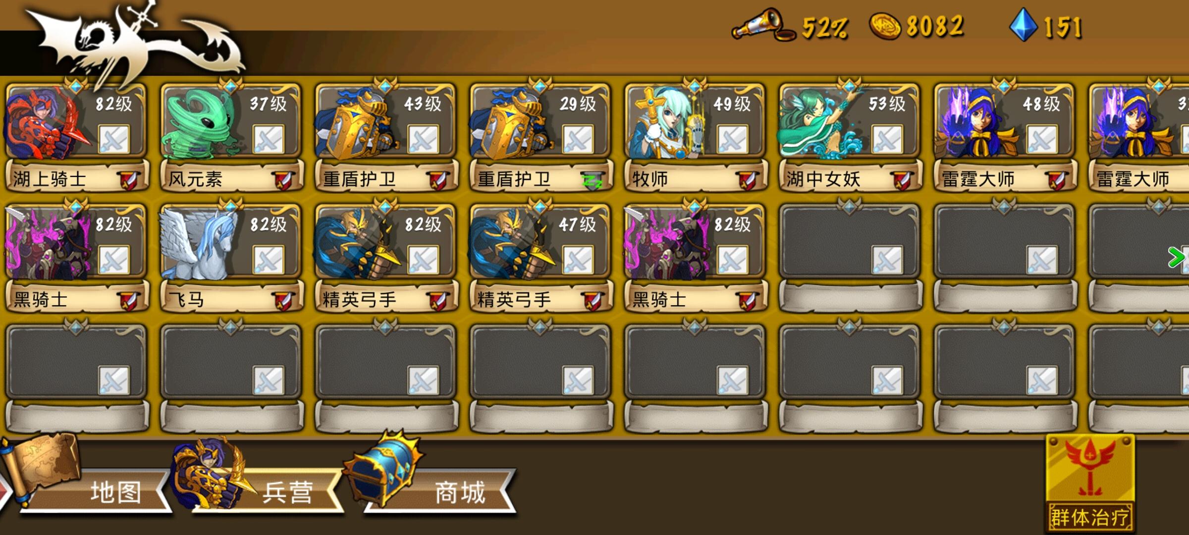 然后是最关键的重盾,我刷了2个幸运盾兵,这家伙皮糙肉厚,有一定概率免疫物理伤害,尤其是精英弓箭手(这玩意儿,在他攻击范围之内,他一个连射后排得嘎一个)所以建议抓两个有远攻的输出。