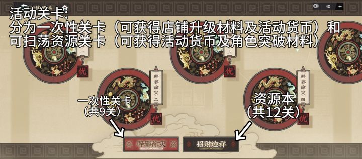 分为【辟邪除灾】和【招财迎祥】两类关卡,其中【辟邪除灾】为一次性挑战关卡,通关可获得活动道具(其中1/3/6可额外获得商铺升级道具),【招财迎祥】为资源本,通关可获得器者突破材料及活动道具(活动道具兑换比为25体力=625活动道具)