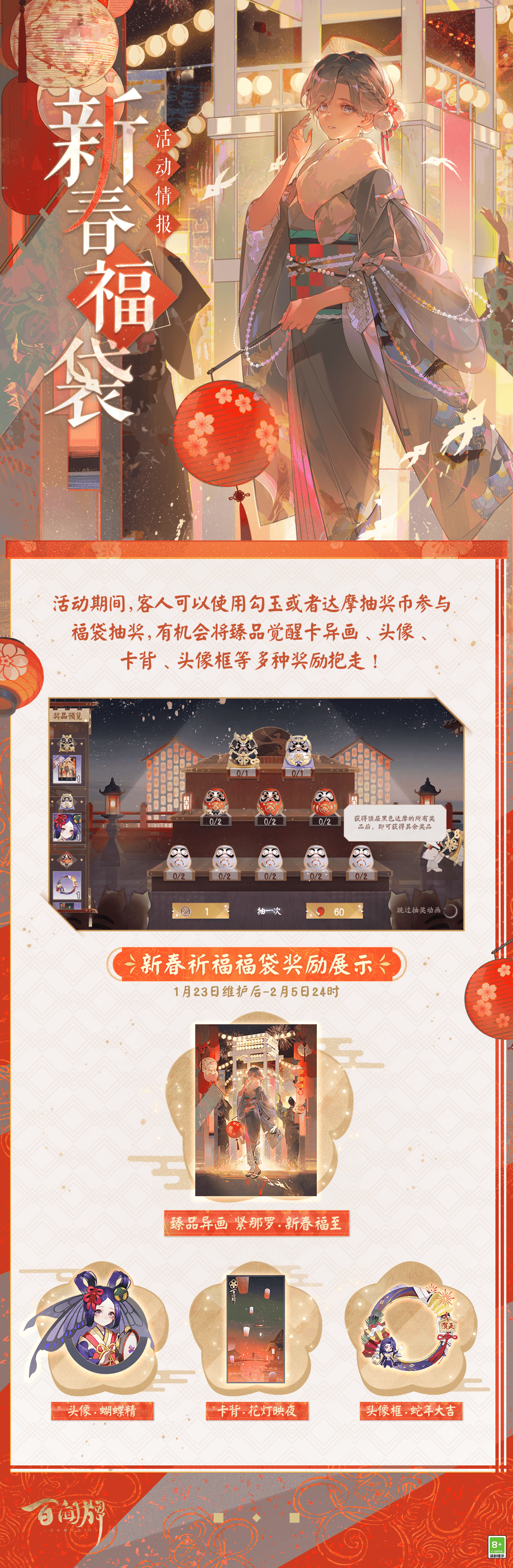 新春呈祥,福满乾坤!新春祈福福袋抽奖活动已于1月23日维护后开启!客人们参与抽奖就有机会获取臻品觉醒卡异画、限定头像框、限定头像与限定卡背等丰富道具~!