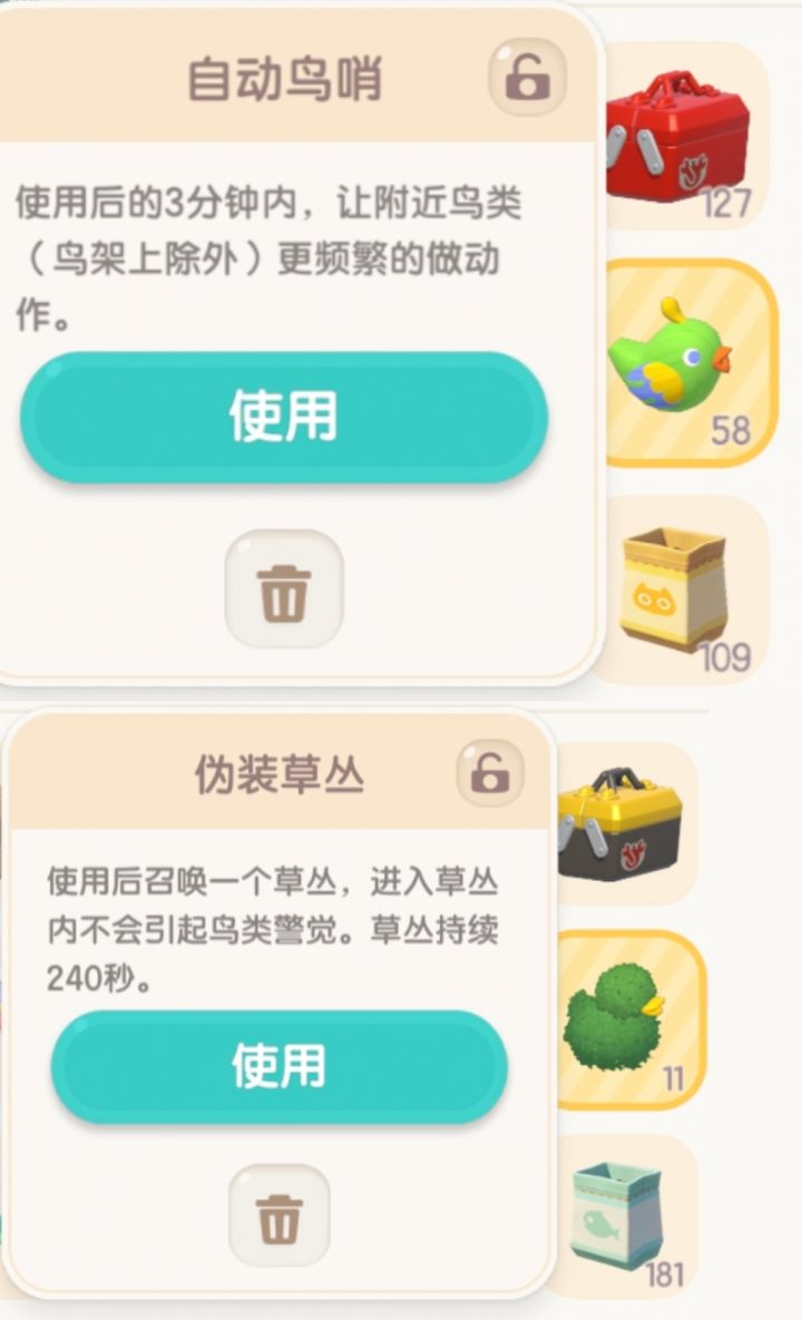 草丛的话适合用来拍5星,因为可以避免鸟受到惊吓飞走,刷经验也能用,当附近有3只以上的高经验鸟类的才合适,虽然能移动但是不适合在小地区之间,比较慢,对于刷经验来说就是他的拍3张不会飞走换位置,而是你拍9-10张后直接消失,不用跑路找鸟飞走的位置了。售价有点贵,2满愿星,6级观鸟解锁,持续时间4分钟。