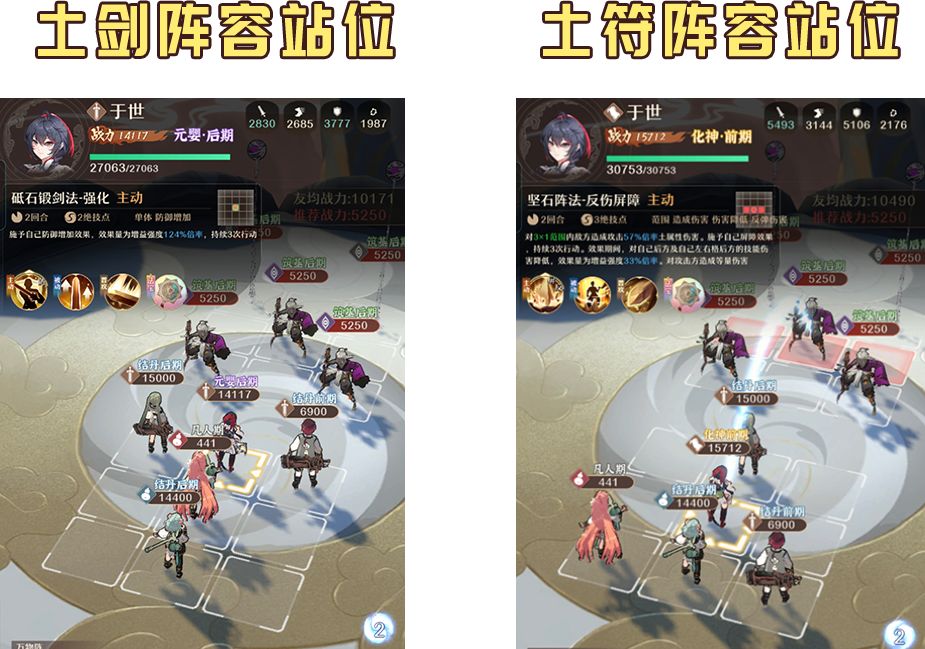 如果是选的土剑,可以选择T型站位法,把于世放到第一排,能最大程度的利用于世的抗伤能力。