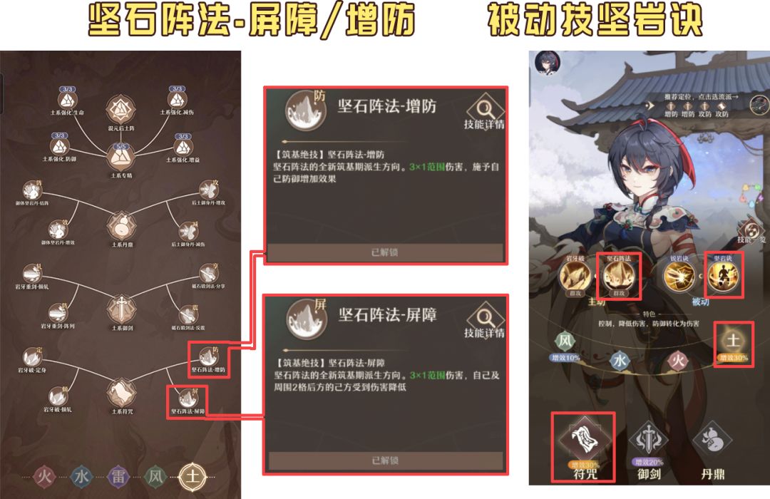 如果是当后排输出和辅助来用的就选土符,技能推荐坚石阵法-屏障/增防,被动技能就选坚岩诀,同时修炼的话就选择灵护和气力的为主修和辅修,再顺带点体质,也是敏捷不是很重要,用三灵护,两气力,一体质的搭配。