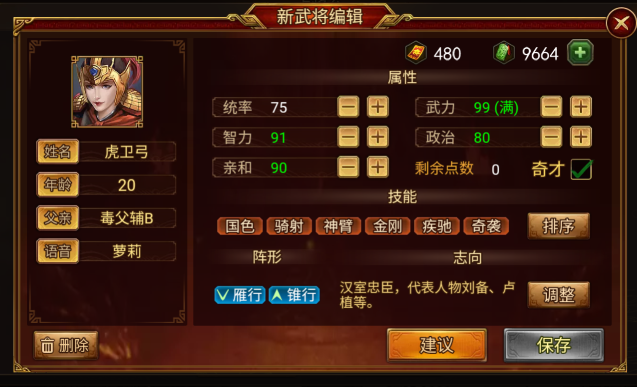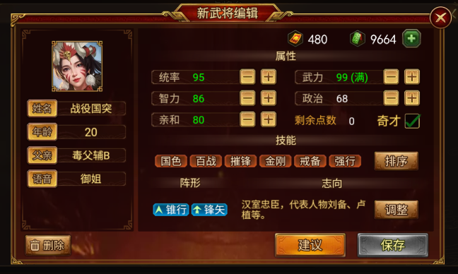 后期玉符多时可以自两个老登带中登,中登带小登套娃进剧本,以下为大老登(42岁带5个28岁的中登)--99智力带进去命名为谋主建议基本不会失误,点政治80能直接提拔为军师2w兵