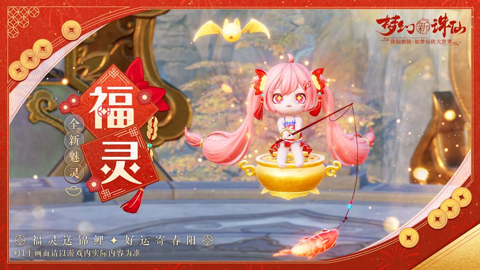 福灵送锦鲤,好运寄春阳!福神化身魅灵,祝你新年福气满满!新年魅灵「福灵」登场,萌萌少女持钓锦鲤赐福,恭祝道友年年有“鱼”!全新魅灵结缘活动限时开启,期间获得福灵的概率大幅提升,镕锻仙石、神铸令、天帝琼浆、可爱魅灵等珍稀好礼等你带回~