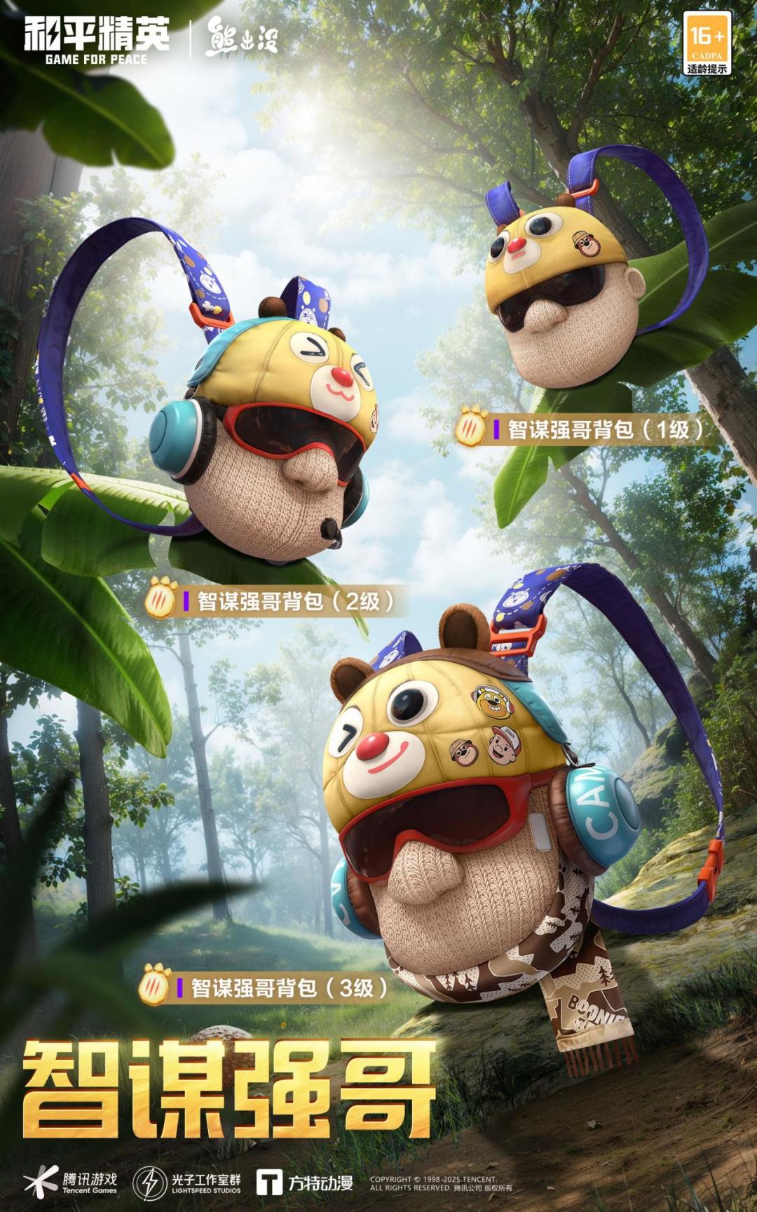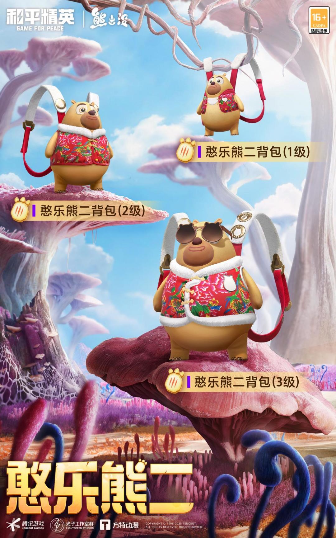 除了「玩偶服-酷勇熊大」、「玩偶服-憨乐熊二」、「套装-熊抱抱」、「套装-智谋强哥」之外,《和平精英》还将推出背包、破片手榴弹等联动道具。电影原班配音演员定制游戏语音包「熊出没」也将同步上线!