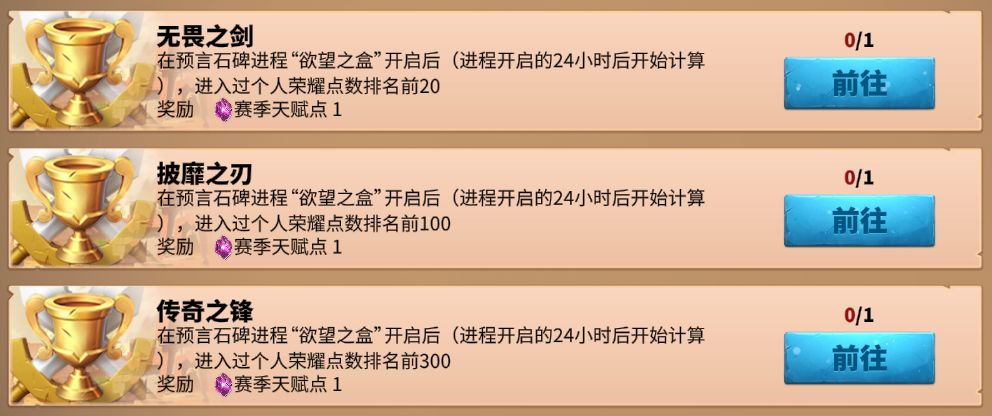- 天赋点获取任务中,有14点天赋点可以随着预言石碑进程推进,即可完成任务进行获取;有4点比较容易获取比较容易获取;有3点则需要各位领主在“欲望之盒”开启后(进程开启的24小时后开始计算),进入过个人荣耀排名前300、前100、前20(每个任务分别获取1点)。