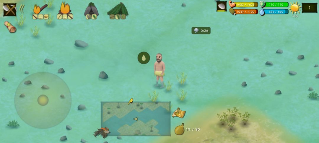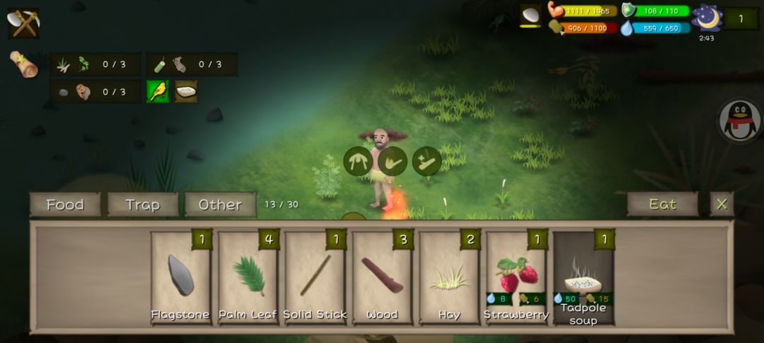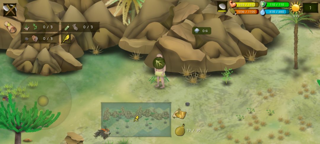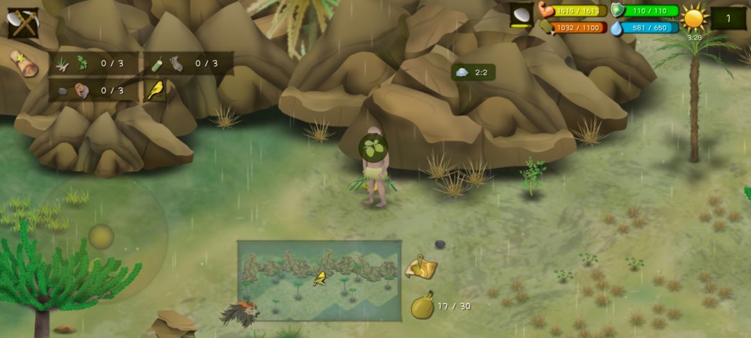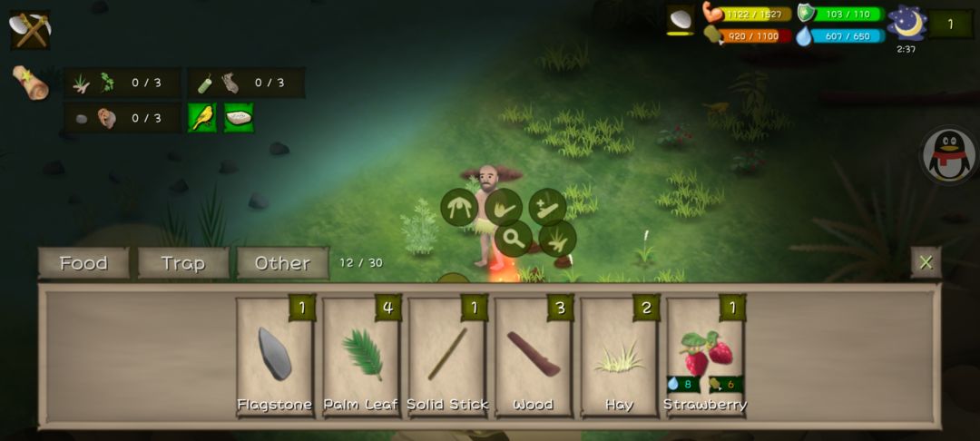 做完石刀不要犹豫马上向下走,切一块树皮,拿一个树脂再薅两个野草莓就往右走,沿途拿1个木棍1个干草和一些木头(采集大的干草堆会拿到3个干草,不需要理会,这不是重点)