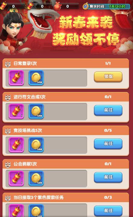 活动期间每日完成新年任务,可以获取爆竹奖励!