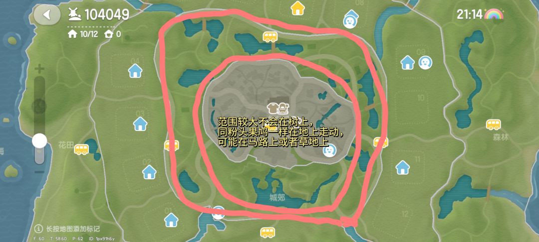 两个圈圈夹着的才是刷新位置,不包括中心城区。跟粉头果鸠一样不会出来在树上,大概率在南部城郊的马路上走